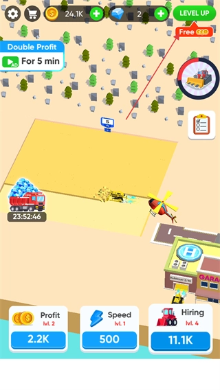 《挖掘大亨》是一款聚焦矿业工地经营的模拟经营类游戏。玩家将从一座小型矿场或者仅有一台挖掘机开始,踏上创业征程。在游戏里,玩家可以通过挖掘金矿、钻石等珍稀矿石资源,或者达成道路修建、场地开挖等工程任务来积累初始资金。在此过程中,玩家需要依据市场动态灵活调整策略,合理进行投资,购置更为先进的挖掘设备与运输工具,并且雇佣专业员工并加以培训,以提高作业效率,进而逐步扩大业务规模。