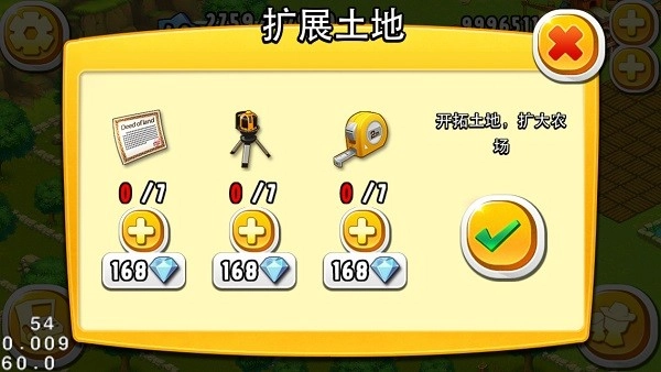 可通过消耗奖券,把土地升级成金土地。金土地能够种植产量高的杂交作物(杂交作物的种植需有研究所建筑,并消耗5000金币)。点击土地旁的感叹号就能完成升级。