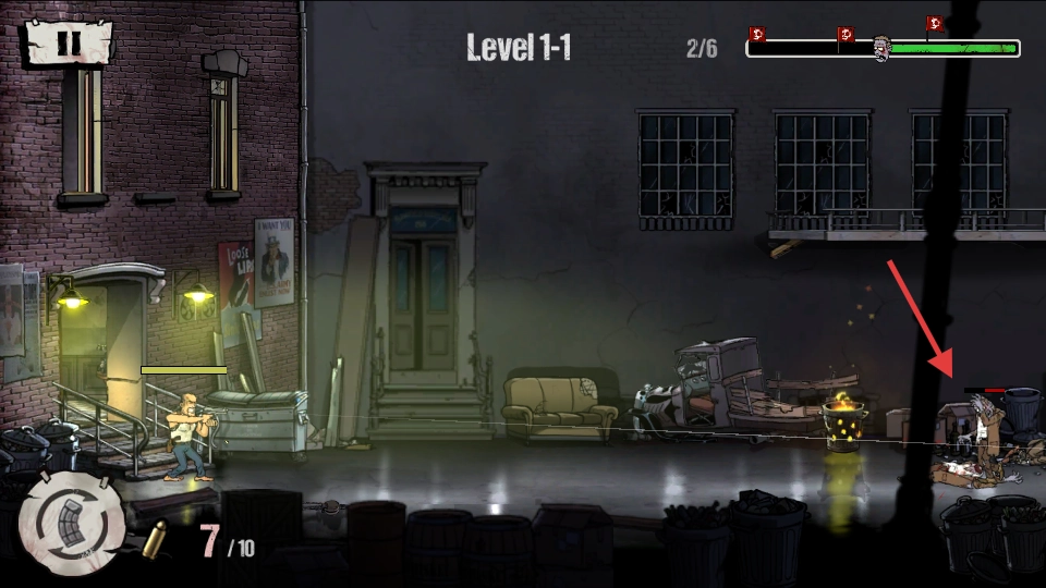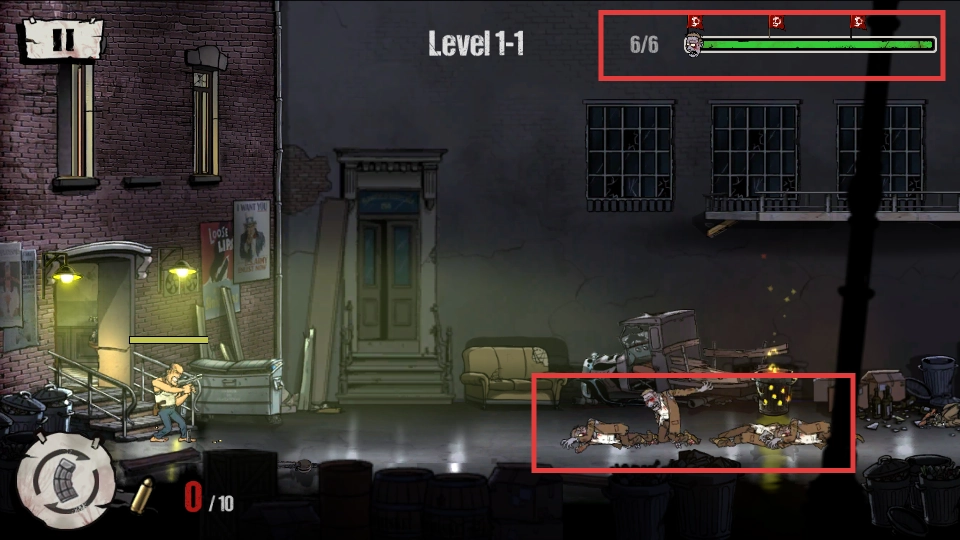 2、于【Level-1-1】关卡里,对准右侧僵尸开枪射击,注意弹药量【7/10】,借助场景中的掩体躲避危险。