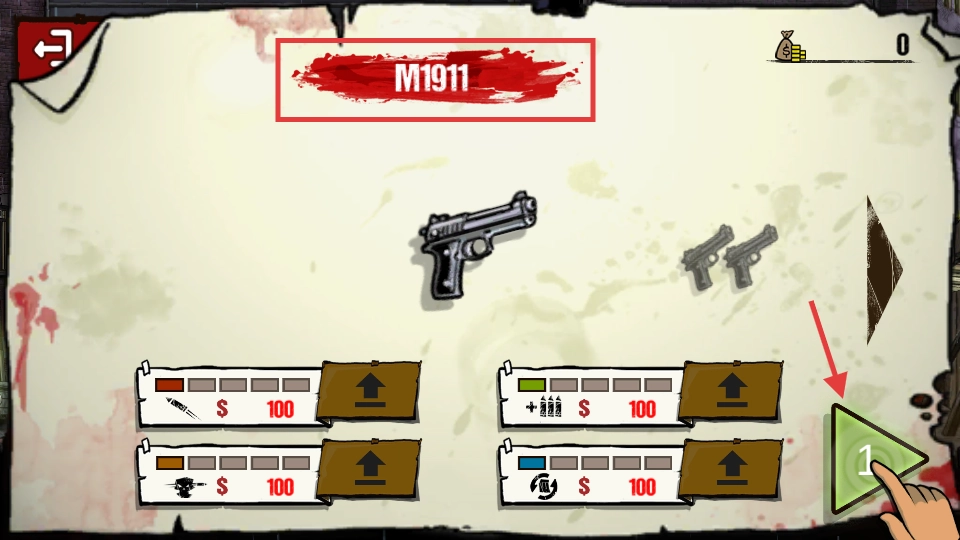 1. 初始配备的武器是【M1911】,其武器属性能够进行升级,点击绿色的开始按钮即可进入关卡备战阶段。
