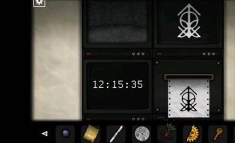 留意显示屏,取走右下角的「纸条」,同时牢记时间「12:15:35」,接着拿走桌子下方的「红色弹珠」。