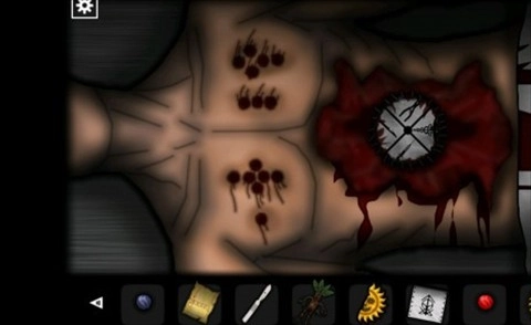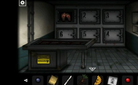 从停尸房出来后,前往右边的房间。在房间里,取走桌子上的「锤子」,接着用钥匙打开房门并进入。仔细查看尸体胸口处的伤痕,从而得到密码「1635」。随后,使用解剖刀割开尸体肚子上的线,获取「金属盘」。