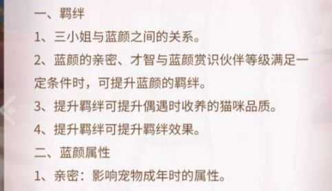 1、宠物的获取途径为蓝颜偶遇,其品质与蓝颜的羁绊等级挂钩。因此,前期重点提升某一个蓝颜的羁绊,如此便能获得品质更优的宠物。除了蓝颜羁绊会对猫咪品质产生影响外,蓝颜的亲密度同样会左右猫咪成年后的属性。