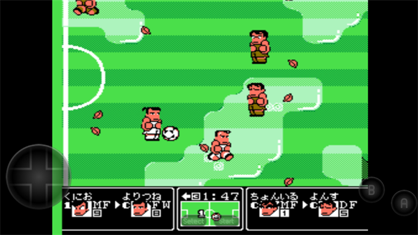 3、带球处于静止状态时,在AB正上方进行挑球操作;若同时按下左右方向键,可向左或右方挑球。在带球跑动过程中,跳起时按A键为传球,按B键则是射门,把握好时间的话,还能发出必杀(在跑动跳跃时同样能够发出必杀)。