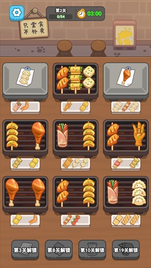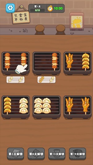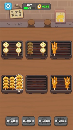 2、玩家仅需把三个一样的串串置于同一个烤肉盘里,就能实现消除。