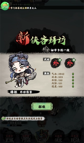 江湖拜帖来招募侠客,逐步完善队伍提升门派实力。