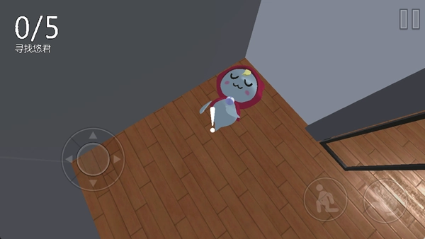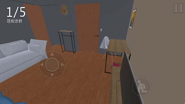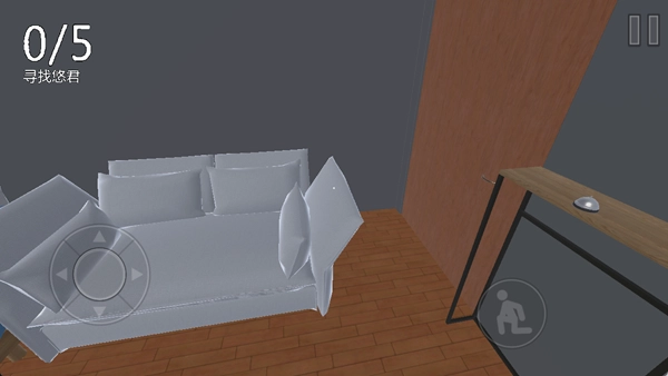2. 通过虚拟摇杆进行移动,在沙发、桌子等区域翻找,一旦发现悠君,就靠近并收集。