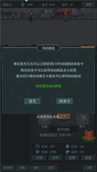 3、只需点击自动挑战,就能开启自动战斗。激活首充礼包,可即刻获取2小时自动挑战体验卡;购买终身卡,则能得到自动挑战的永久权限。激活之后,在打砸抢和摩天大楼玩法中同样能够使用自动挑战功能。