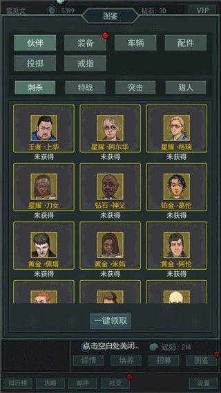 4、点击图鉴,即可查看伙伴、装备、车辆、配件、投掷物、戒指等内容。此外,还能查看具有不同属性的伙伴。若已获得相关物品,点击“一键领取”即可。