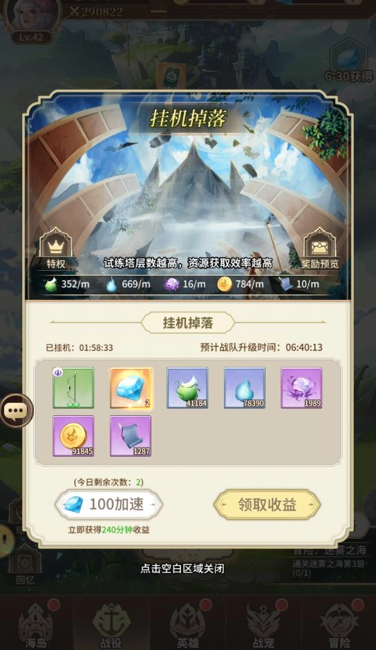 当冒险进程陷入停滞时,持续获取经验的高效途径唯有自动积累模式——该模式的收益会随核心印记的成长同步提升。系统每日提供四次机会,可通过加速功能一次性领取四小时的累积收益(其中后三次加速需消耗少量钻石),这是提升等级的关键节点,建议每位探索者都不要错过。此外,解锁专属特权还能额外增加加速获取收益的次数。
