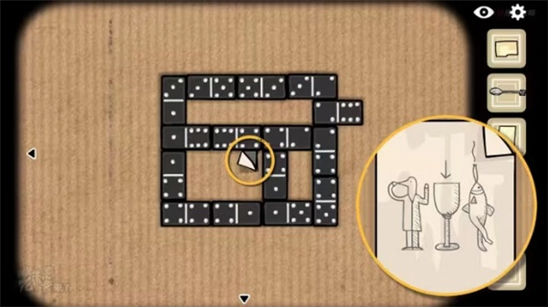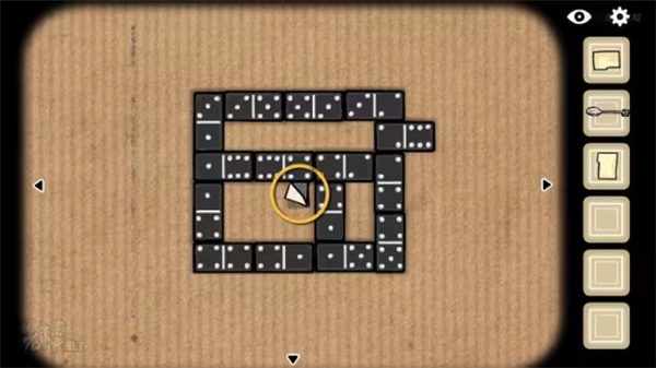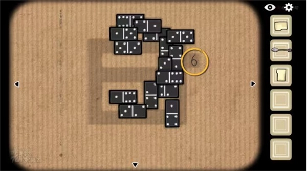 从玻璃瓶的角度观察,骨牌呈现出字母【6】的形态,这意味着该位置骨牌的右侧应对应6个点的图案。符合这一条件的骨牌仅有两张,通过尝试组合,最终能够拼出完整的图形。
