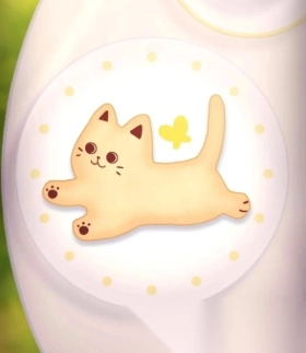 桌上的瓷盘里有猫饼干,拿上它。