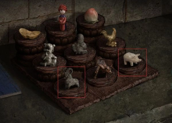 这类机关以羊、猪等造型的雕刻品为主体,搭配圆形承托结构,可能是通过特定的摆放或触发方式来实现功能的“生肖/物件对应装置”,其设计融入了传统民俗的象征意义,常被用于文化类解谜场景中关键线索。