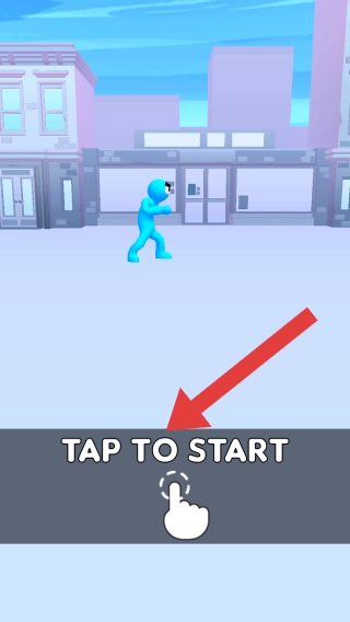 画面中呈现【TAPTOSTART】(点击开始)的提示,视觉元素包含蓝色火柴人角色与城市街道场景,该内容归属于休闲动作类型。