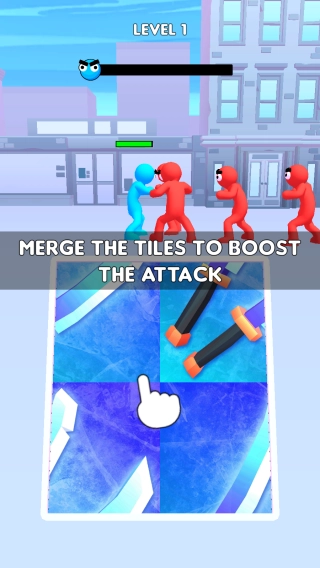 处于“LEVEL1”关卡,玩法提示为“合并方块提升攻击”,画面呈现红蓝火柴人对战场景与合并方块操作界面,是一款融合动作与合成玩法的休闲游戏,核心机制为通过合并方块增强攻击能力以推进战斗进程。