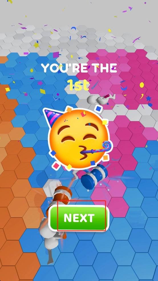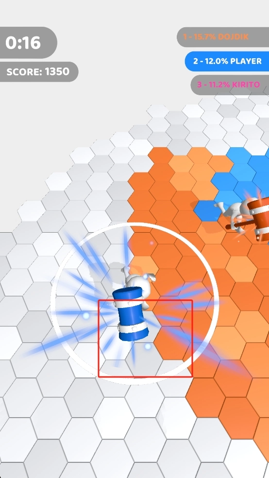 利用工具的攻击范围与冲击力,将对手的角色击退,占领六边形格子,拓展自己的领地,从而增强分数上的领先优势。