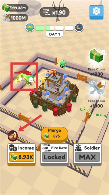 当士兵数量达到上限后,【Soldier】的下方会出现【MAX】标识,此时点击【Merge】按钮就能把士兵合成升级,得到等级更高的士兵。
