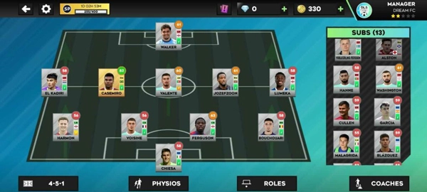 在游戏的团队管理界面中,玩家能够对教练团队进行升级操作,涵盖体能、技术、数据分析、球员管理以及门将专项等不同领域的教练类型。此外,该界面还支持球员名单的调整,包括更换出场阵容、设定比赛策略、调整阵型排布等战术配置,帮助玩家优化俱乐部的整体竞技表现。