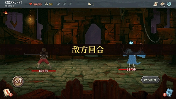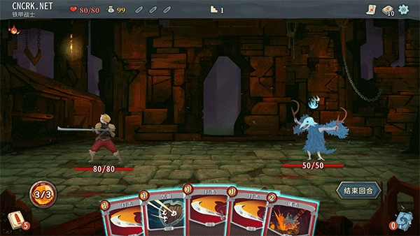 在对战开始后,每个回合玩家会持有五张可用的牌,同时拥有三次行动机会,当三次行动机会全部用完时,就会轮到对手进行操作。