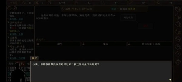 收集十条蚯蚓,然后前往清水镇的湖边找到姜沉进行对话,在对话选项中选择将这10条蚯蚓(属于杂项/其他类物品)给予对方。