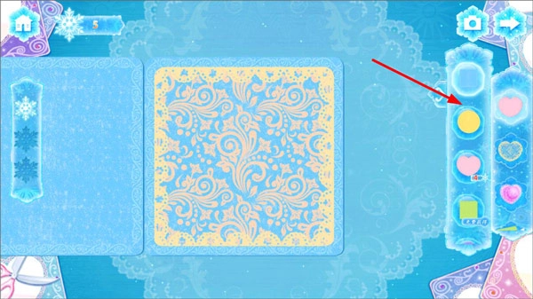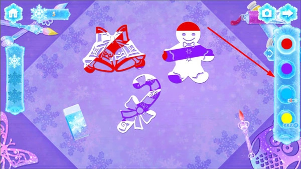 玩家进入创意填色互动界面后,需为各类装饰元素添加色彩。按照屏幕上的手势引导,拖动右侧的颜料色块至对应装饰区域完成填充,最后点击保存按钮即可完成操作。