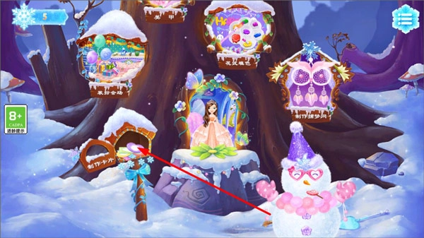启动莉比小公主冰雪主题的派对游戏后,会进入包含多种互动玩法的主界面,这里可以体验堆雪人、手工制作捕梦网、设计美甲样式、布置派对场地等活动,接下来选择制作卡片的功能选项。