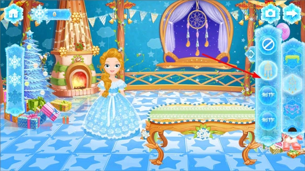 打开莉比小公主之冰雪派对游戏,进入主界面,这里有装扮会场、花式填色、制作卡片、制作铺梦网、堆雪人等多种玩法,接着点击装扮会场选项。