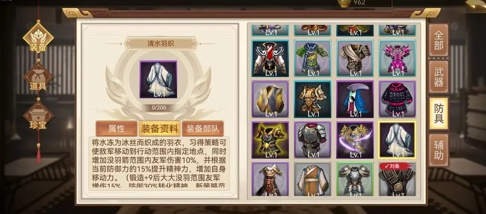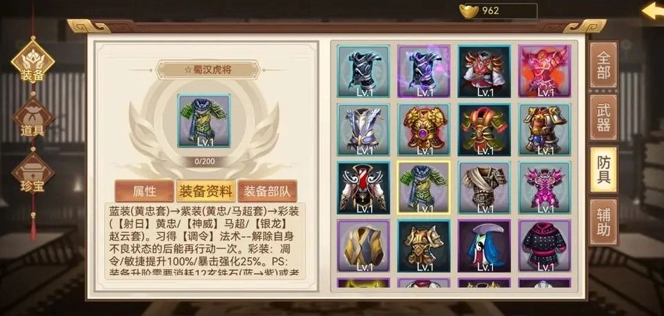 游戏内设有装备养成机制,玩家可将基础装备逐步进阶为更高级的装备。部分武器、护具及辅助装备能组合激活强力套装特性,除了预设的固定套装外,还能通过装备与其他部件的灵活搭配,让武将同时拥有多套套装的属性加成。