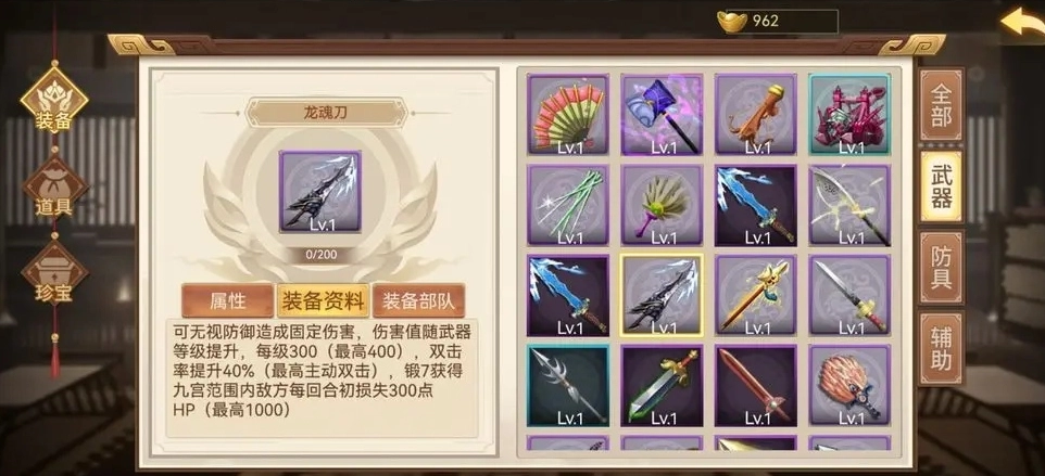 (一)首先要出龙魂刀,这件装备单独使用就能提升战力。它的固定伤害属性能够节省培养点数,这些省下来的点数可以用来加防御或暴击。升级到足以击破当前遇到的敌军就行。