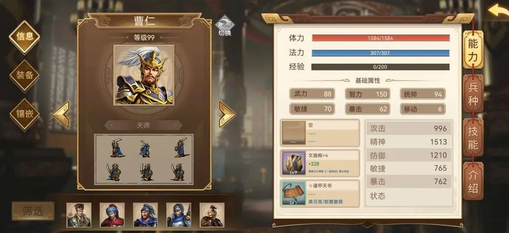 文官曹仁搭配文曲袍与遁甲天书,凭借其主动嘲讽的天赋,再加上文曲袍的减伤效果和遁甲天书的原力护盾加持,在战斗前期堪称敌军难以逾越的叹息之墙。