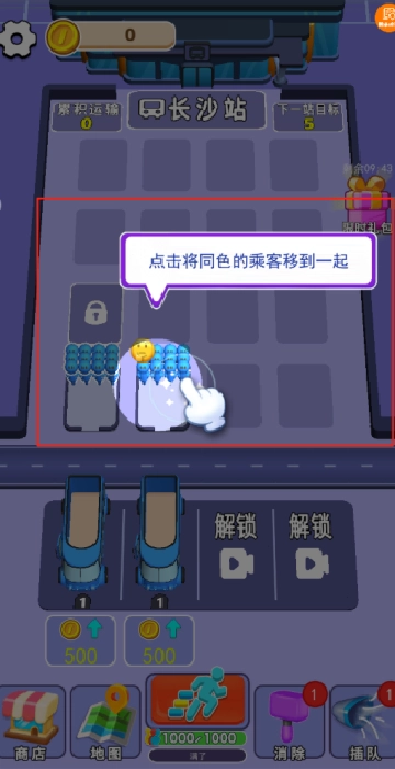 接下来需要选中一伙颜色一致的乘客,安排他们乘坐交通工具,并且必须确保他们登上和自身颜色匹配的车辆。