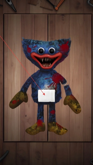 修复玩偶,按提示操作,清理污渍、包扎伤口。