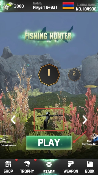 进入游戏界面后,我们先挑选武器,接着点击【PLAY】按钮,就能开启海底猎鱼的冒险之旅,准备迎接各种各样鱼类的挑战啦。