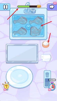 2、进入之后开始第一步,将水池的塞子放上去,然后放入冻住的鸡腿,随后加入水。
