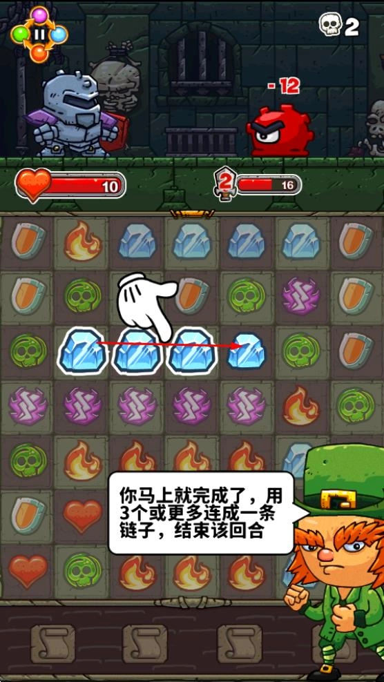 进入战斗界面后,按照提示把3个及以上相同的图案连成一条链子,这样就能结束当前回合并发起攻击。