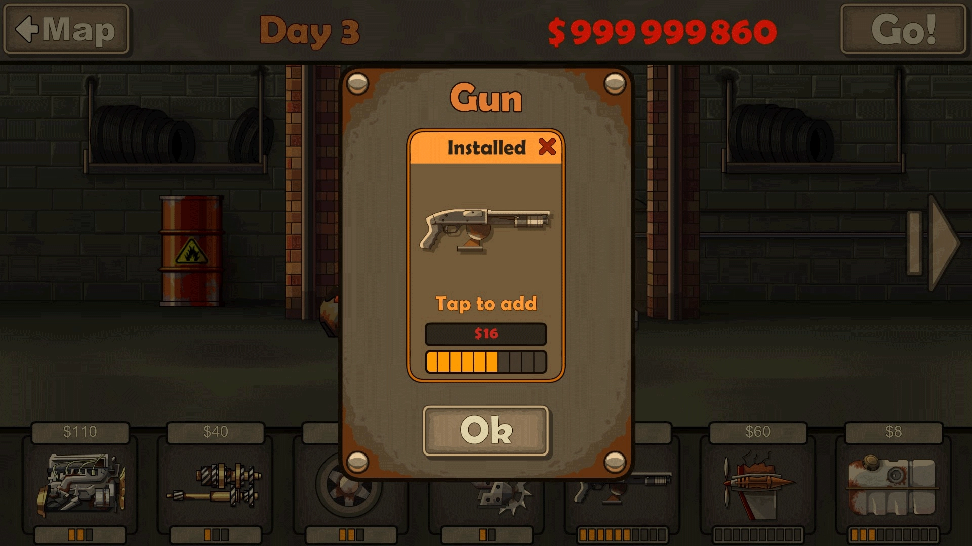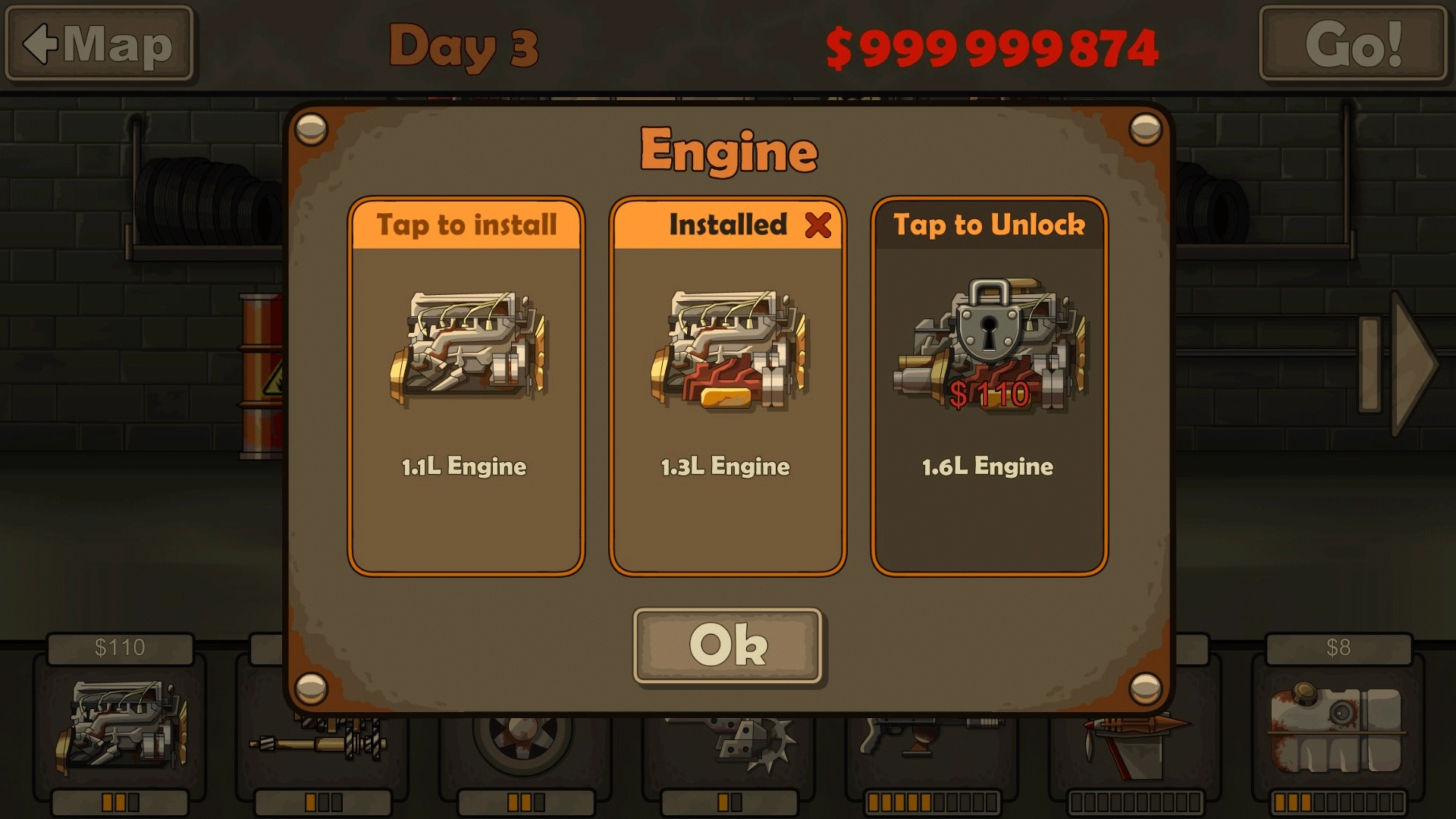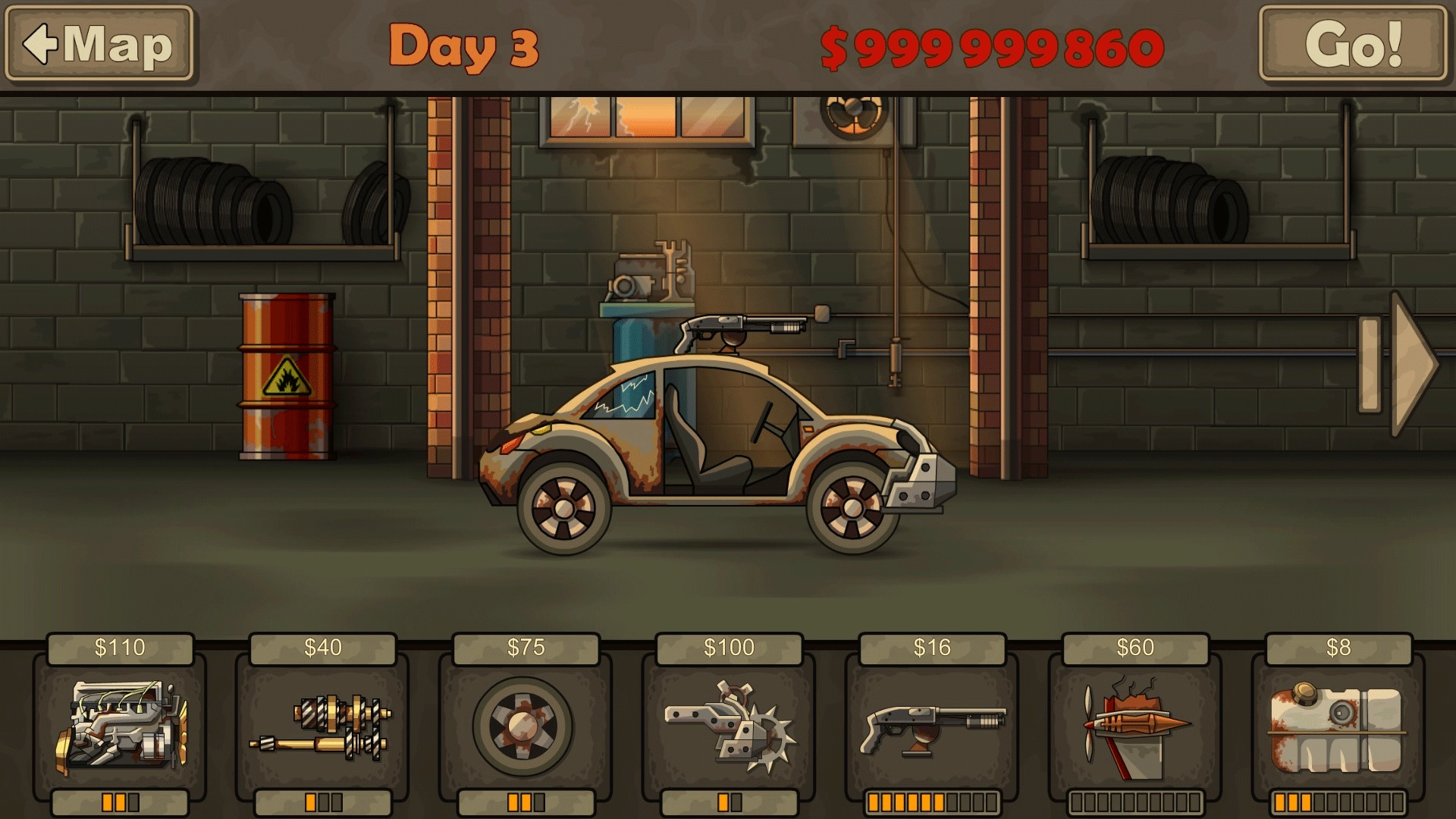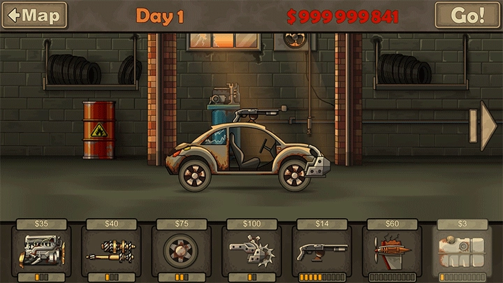 当车辆的燃油消耗殆尽后,系统会跳转至结算页面。此时我们需要点击“Carage”按钮返回车库,对车辆进行进一步的升级操作,完成后即可继续向前行进。