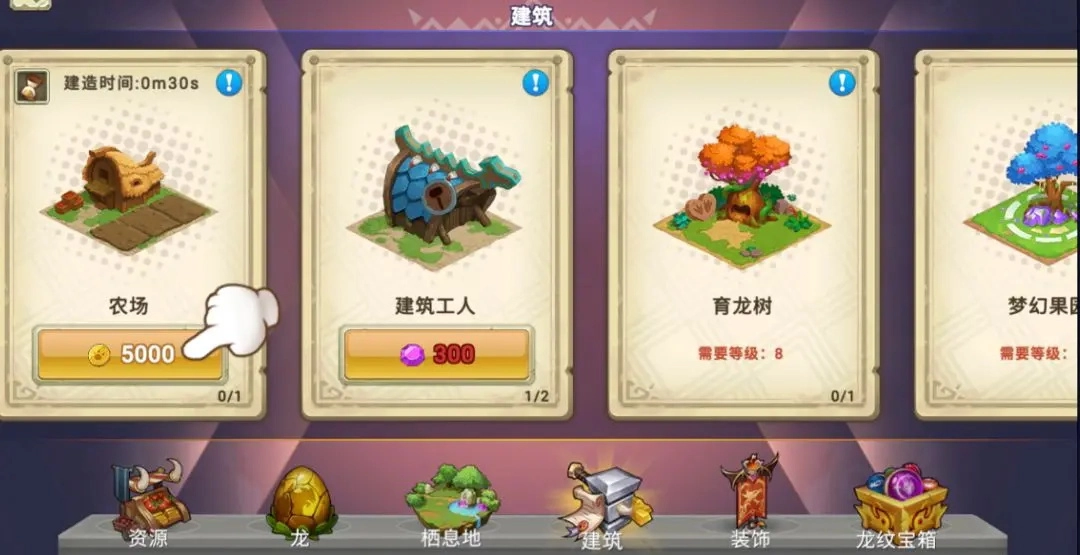 现在我们来了解一下怎样培育龙钟爱的食物!要培育果实,第一步得搭建一个种植园,这和之前搭建栖息场所的方法类似,你能在【商城】-【设施】板块里找到它。