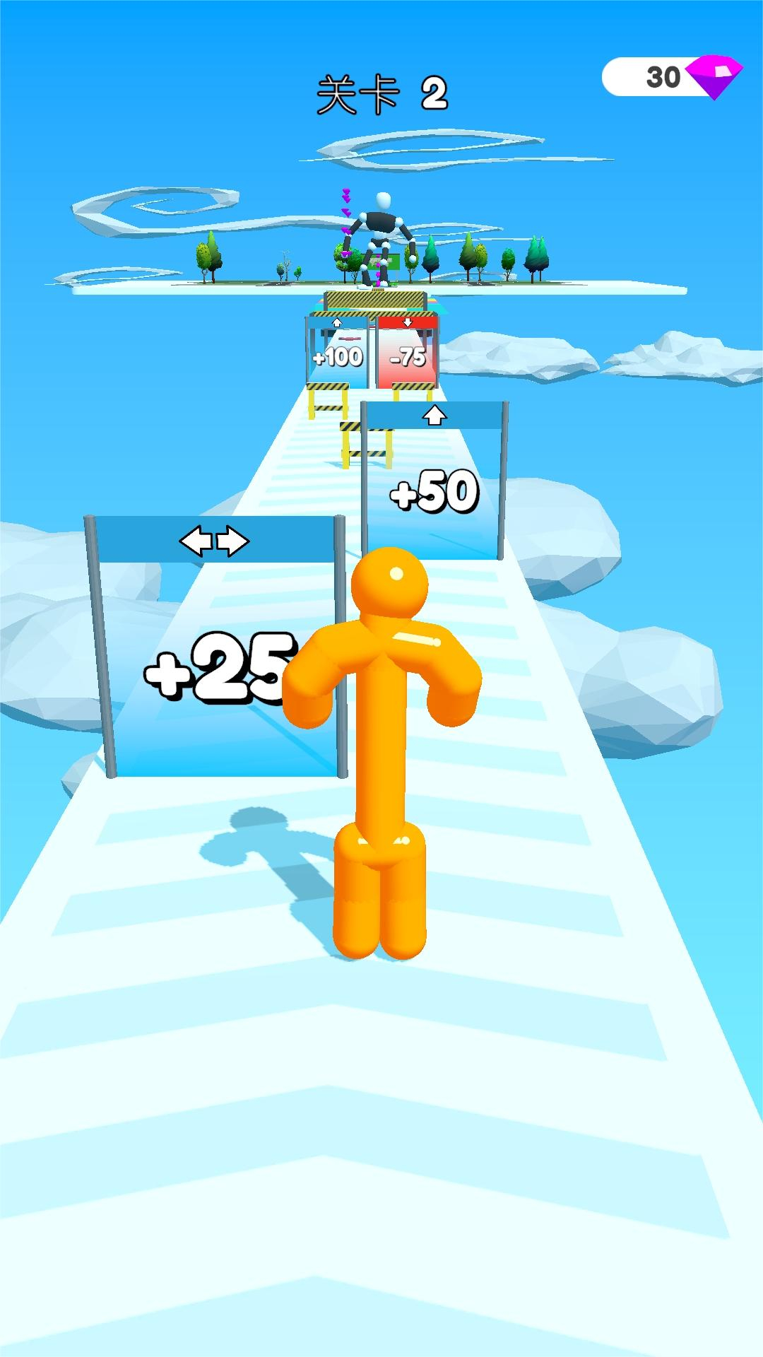 1控制软体角色在关卡里向前移动,拾取沿途物品,让它的身形从纤细变得魁梧,最终成长为威风凛凛的将领模样。