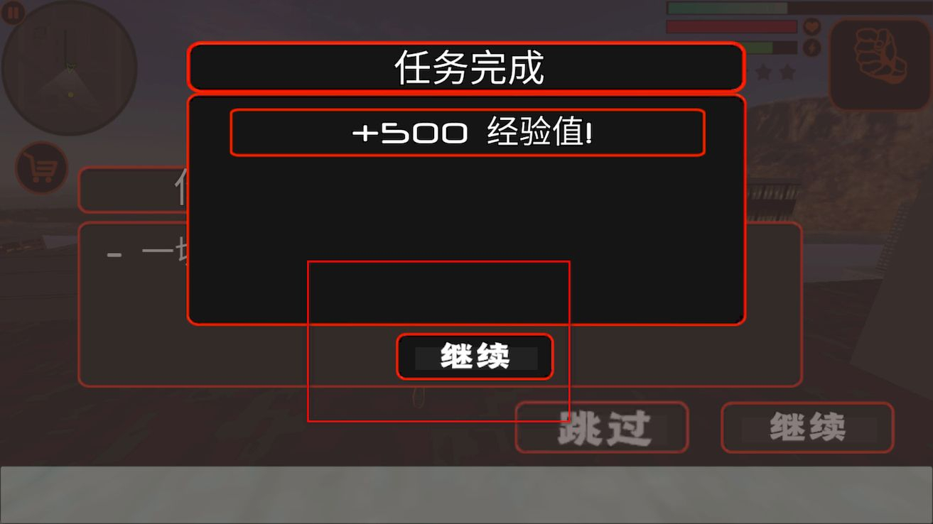 4当一项任务顺利达成后,系统会给出任务已完成的通知,同时你将得到经验值作为奖励,点击“继续”按键就能开启后续的流程。