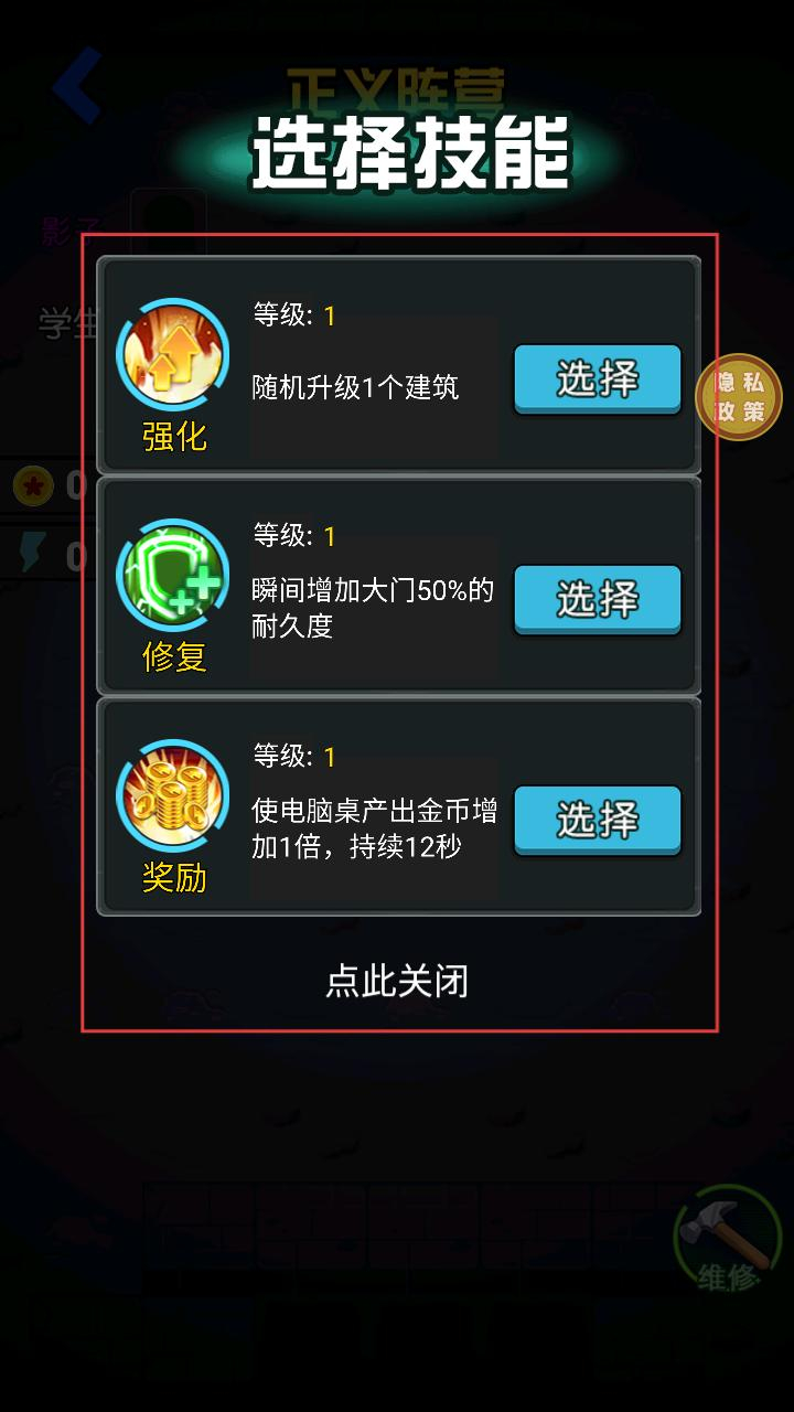 2游戏启动后会进入技能选择环节,你可以根据实际需求,从强化、修复、奖励等不同类型的技能中挑选合适的,以此提升自身的防御水平。