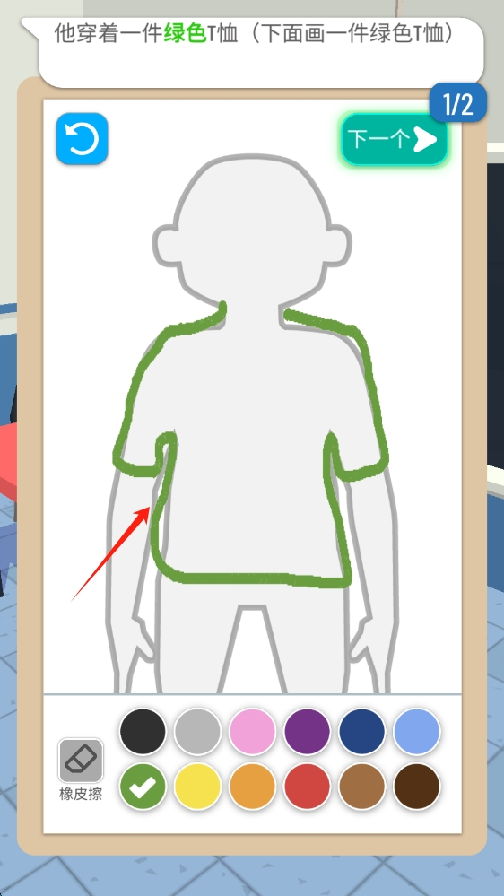 2在解谜环节的绘图任务里,按照指引用绿色绘制T恤衫,完成这一步骤后就能推动解谜继续进行,之后点击绘制衣物的按钮即可。