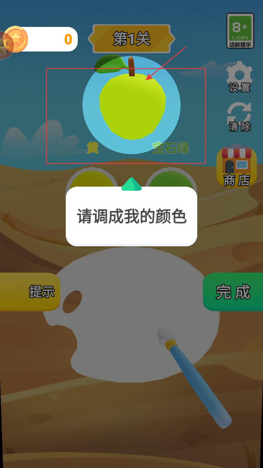1、玩家进入后,需先观察目标苹果的颜色,接着点击下方的黄色与宝石绿两种颜色,在调色板中进行混合操作。