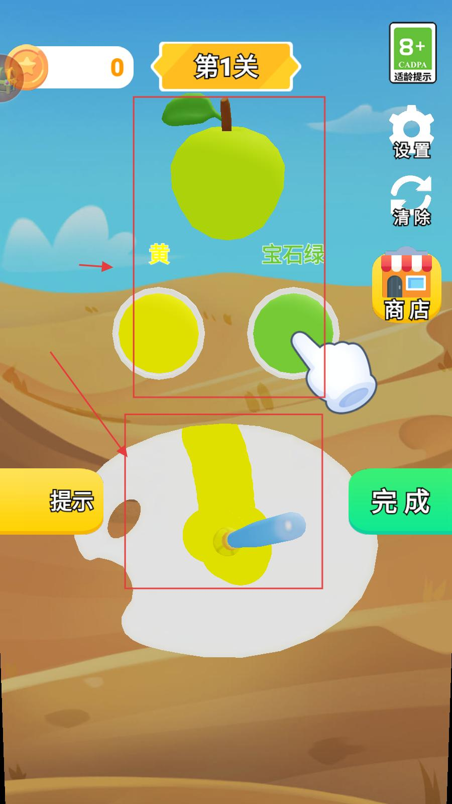 1、混合调色玩法:玩家需把不同颜色相互调配,依据关卡给定的要求调出对应的目标颜色,在反复尝试的过程中逐步熟悉并掌握颜色混合的内在规律。