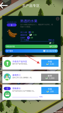1、在农产品专区的熟透水果商品界面,会展示商品价值与客户服务收益,点击该界面即可升级农产品专区。