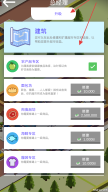 2、游戏内店铺升级界面中,农产品专区已搭建完成,面包坊当前可进行修建;像肉食品坊这类其他店铺,则需先建成其对应的上级商店才能解锁。后续计划进一步拓展业务范围,以此提升超市的整体收益。