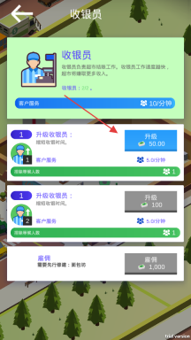 3、收银员板块支持两种操作:一是点击升级已有的收银员,二是在建立面包坊后雇佣新的收银员,以此优化结账流程。