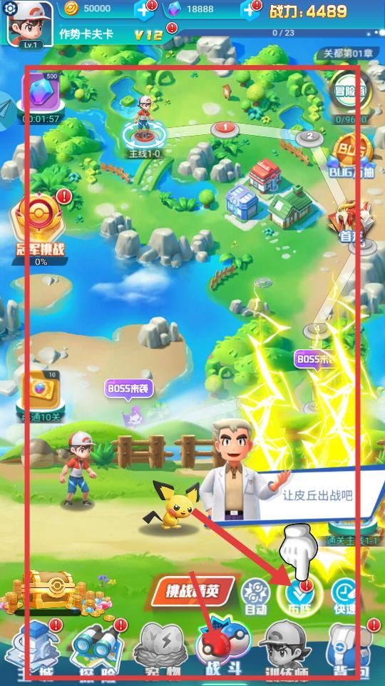 1踏入游戏世界,映入眼帘的是满溢奇幻色彩的地图景致,界面会弹出诸如派遣特定精灵登场的指引提示;点击对应功能按钮即可进入精灵编队界面,为接下来的对决预先做好配置,正式开启这段游戏冒险。