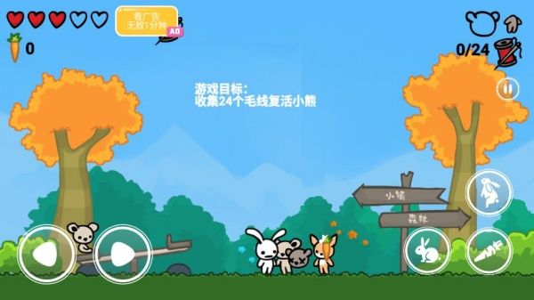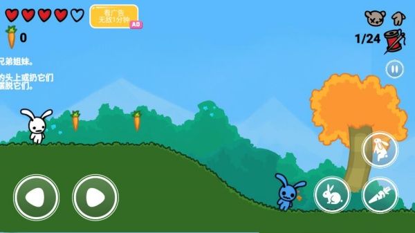 1玩家将操控一只兔子在横向展开的关卡中前进,通过跳跃避开各种障碍,并用投掷胡萝卜的方式攻击敌人,借助一系列连贯的操作来突破关卡中的重重阻碍。