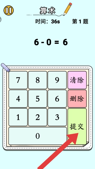 3第三点,在第一题的情境下,题目类型均较为容易,需在限定时间内完成计算,得出结果后点击提交按钮方可进入下一道题目。