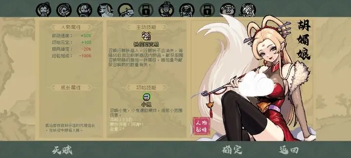 天赋方面,藏钱天赋是必点的核心选择。胡媚娘的机制是经验获取-100%,这意味着没有额外经验加成时,她全程都只能停留在1级,就算有经验加成升级也很慢;而1级的免费技能基本等于摆设,自带的小鬼技能伤害又极低,往往只能造成1点甚至更低的伤害。这种情况下,藏钱天赋的作用就格外关键——它能帮你快速解锁第二个技能。 这里强烈推荐第二个技能选“聚宝盆”:开局用藏钱天赋给的银元宝随便买个技能,然后去脚妖商店置换就能拿到(聚宝盆是必刷的)。这个技能和小鬼技能能组合成神通“有钱能使鬼推磨”,前期强度非常高:每只小鬼爆炸后都会生成一个银元宝,靠着这些元宝,你就能在开局阶段快速把所有技能栏都开满。